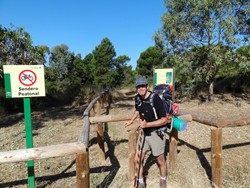 Con la ruta Clásicas Veredas Cordobesas estrenamos la vereda que nos permite llegar por el campo hasta el pie de la Cuesta del Reventón*, donde se llega trepando una tremenda subida pedregosa, el Reventón lo subimos como balas hasta las Ermitas, continuamos hasta Assuán muy deprisa llegando hasta casi las Jaras, donde antes de llegar nos desviamos a la derecha entre grandes rocas para cruzar la Pasada del Pino sin parar más que para hacer alguna foto y salir por el campo de golf los Villares hasta la entrada del Centro de Acampada. Yo quería enseñarle aquel bonito y distraído circuito de 2,5 km que había conocido con mi familia a mi amigo Romerillo, por lo que tiré yo delante, pero como llevábamos ese estrés todo el camino, quise estar a la altura de las circunstancias y no conformarme con convertirlo en un idílico paseíto, sino más bien todo lo contrario, por lo que desde el principio cogimos un buen ritmo que se fue acelerando por momentos. Los carteles de motivos botánicos pasaban como centellas a nuestro lado. No creo que Romerillo llegara a apreciar la belleza del paraje pues debieron subirle tanto las pulsaciones y sufrir tal sudoración que se le empañasen las gafas. Las últimas cuestas que tiene el circuito las hicimos como si de una película de cine cómico se tratase, medio corriendo. Al salir nos paramos por fin en una de las mesas de cemento que tienen dispuestas para los que acampen allí. Nos cambiamos de camiseta, nos comimos una piececita de fruta y nos hicimos unas fotos estrenando el sombrero de peregrino. Tornamos hacia Córdoba por el Gran Recorrido nº 48 (GR-48) con tan mala fortuna que Romerillo se escurre en una fuerte pendiente con piedrecitas sueltas y se hace daño en un pie del que quedó muy tocado, hasta el punto que tuvo que detenerse por completo bajando la Cuesta del Villar, en el abrevadero que está a medio camino. Teniendo que volver yo solo hasta el coche en la Arruzafa a recogerlo hasta el Cerrillo, a donde pudo llegar pasando un doloroso calvario. ¡Mala suerte! -En el DVD al llegar a este punto se escucha la triste melodía del Requiem de Mozart-.