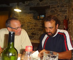 Poco antes de terminar el almuerzo se presentó en la posada un chico alto con barba, con visibles muestras de cansancio y se sentó en la mesa de al lado. Era Sergio, un pescadero catalán, de Sabadell, de origen murciano, que por su gracia podría haber sido andaluz, de Cádiz. Enseguida entablamos conversación con él y pronto congeniamos. Hacía el Camino por una promesa que había hecho tras una enfermedad muy grave de la que había salido recientemente su madre. La seriedad de su motivación y de su rostro al referirnos sus recuerdos, así como los padecimientos de su recorrido comenzado tres semanas atrás en Roncesvalles en la frontera francesa, contrastaba con el alegre espíritu con que enfrentaba el Camino y la propia vida. Aunque ya habíamos terminado de comer, lo acompañamos un rato muy divertido hasta que nos fuimos a echarnos un rato en la cama, que era lo que nos pedía a voces nuestro cuerpo.
