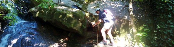 Tras dejar constancia de las hermosas cortinas de agua y de las cascadas entre las rocas más espectaculares, encontramos junto a las ruinas un gran tronco tendido sobre el lecho del arroyo, que nos servirá para reposar a modo de gran diván natural en nuestra ansiada parada.